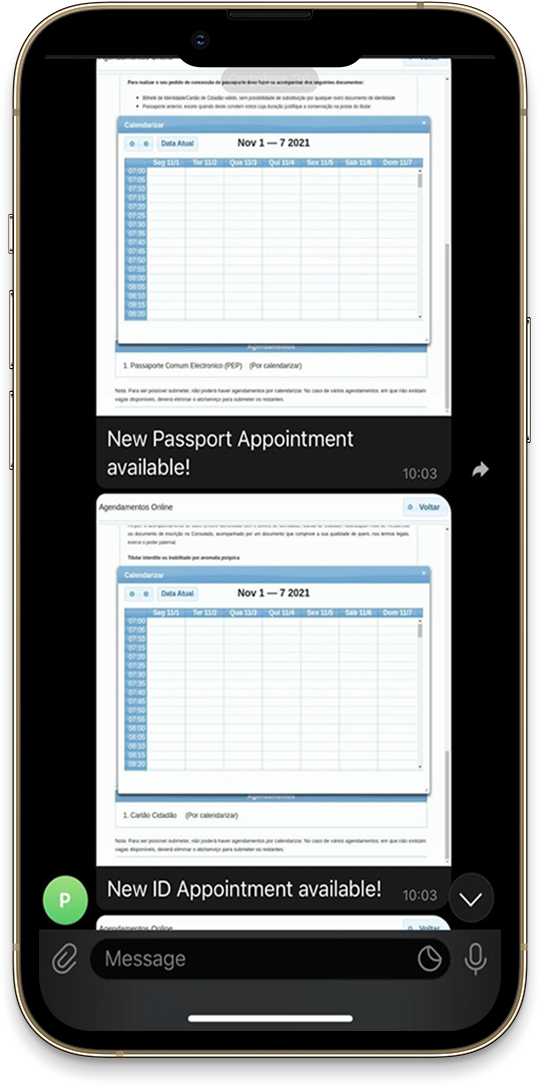 מערכת התראות חכמה לזיהוי תורים חדשים באמצעות אפליקציית Telegram לאתר שגרירות פורטוגל המאפשרת לכם גישה מהירה לקביעת תורים והתראה בזמן אמת.